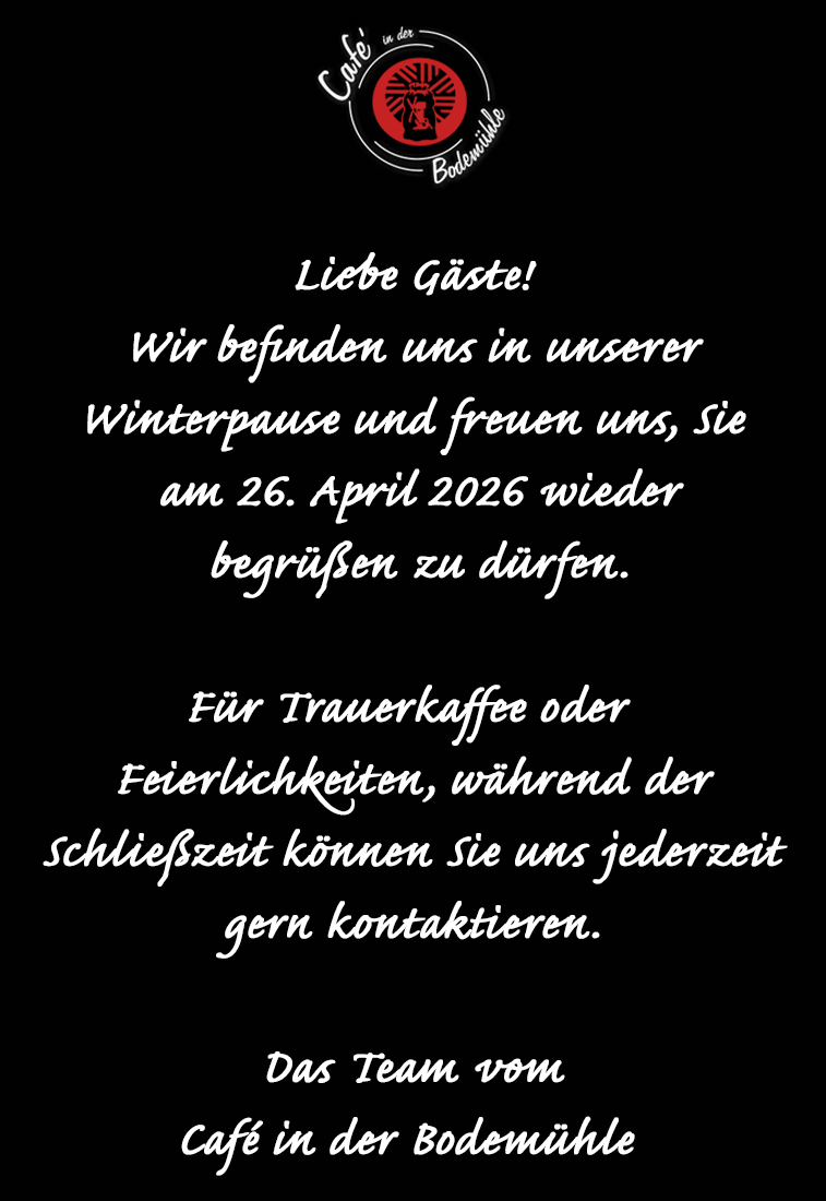 Mit der traditionellen Grußformel der Müllersleute heißen wir Sie herzlich Willkommen in unserem Cafe' in der Bodemühle...wo Geschmack und Tradition zuhause sind.